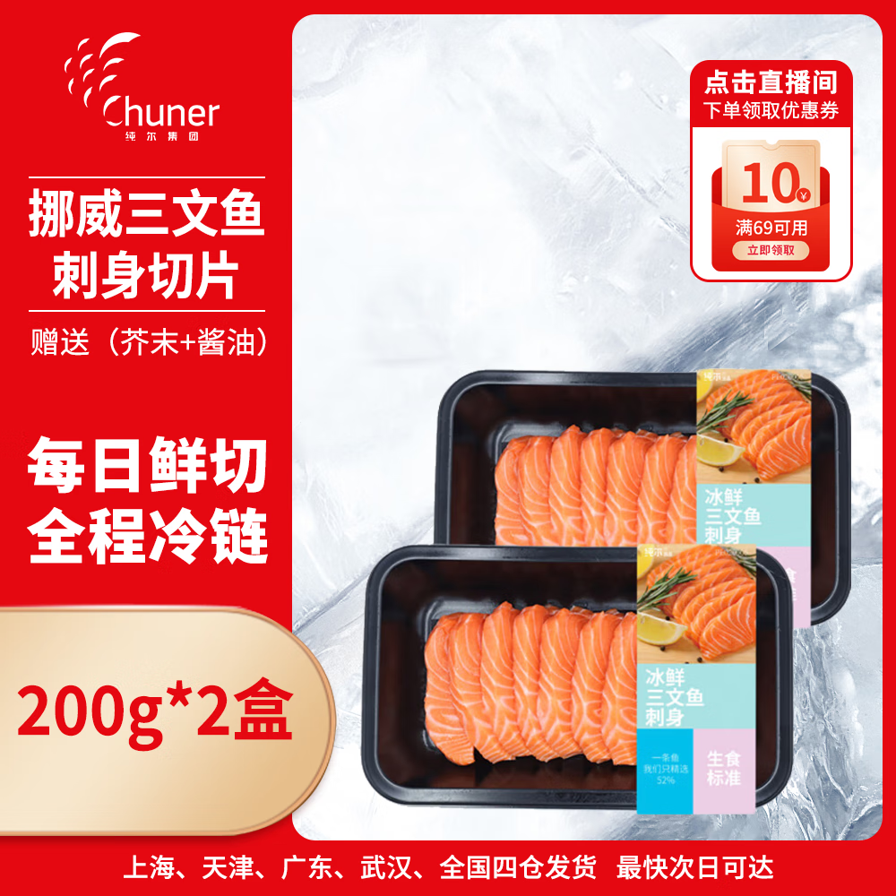 包邮 纯尔挪威三文鱼切片【冰鲜即食】净重200g*2 生鲜 源头直发 可生食